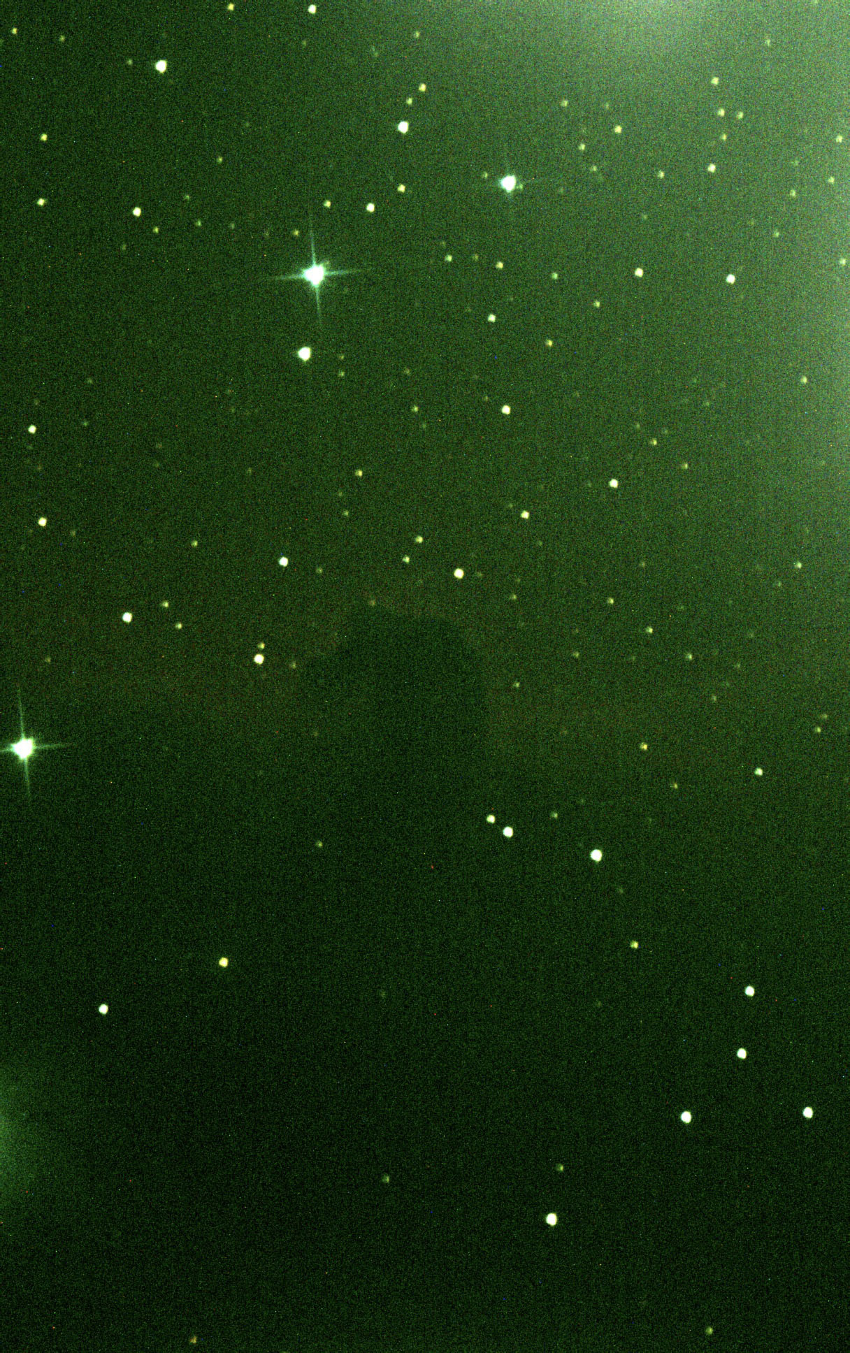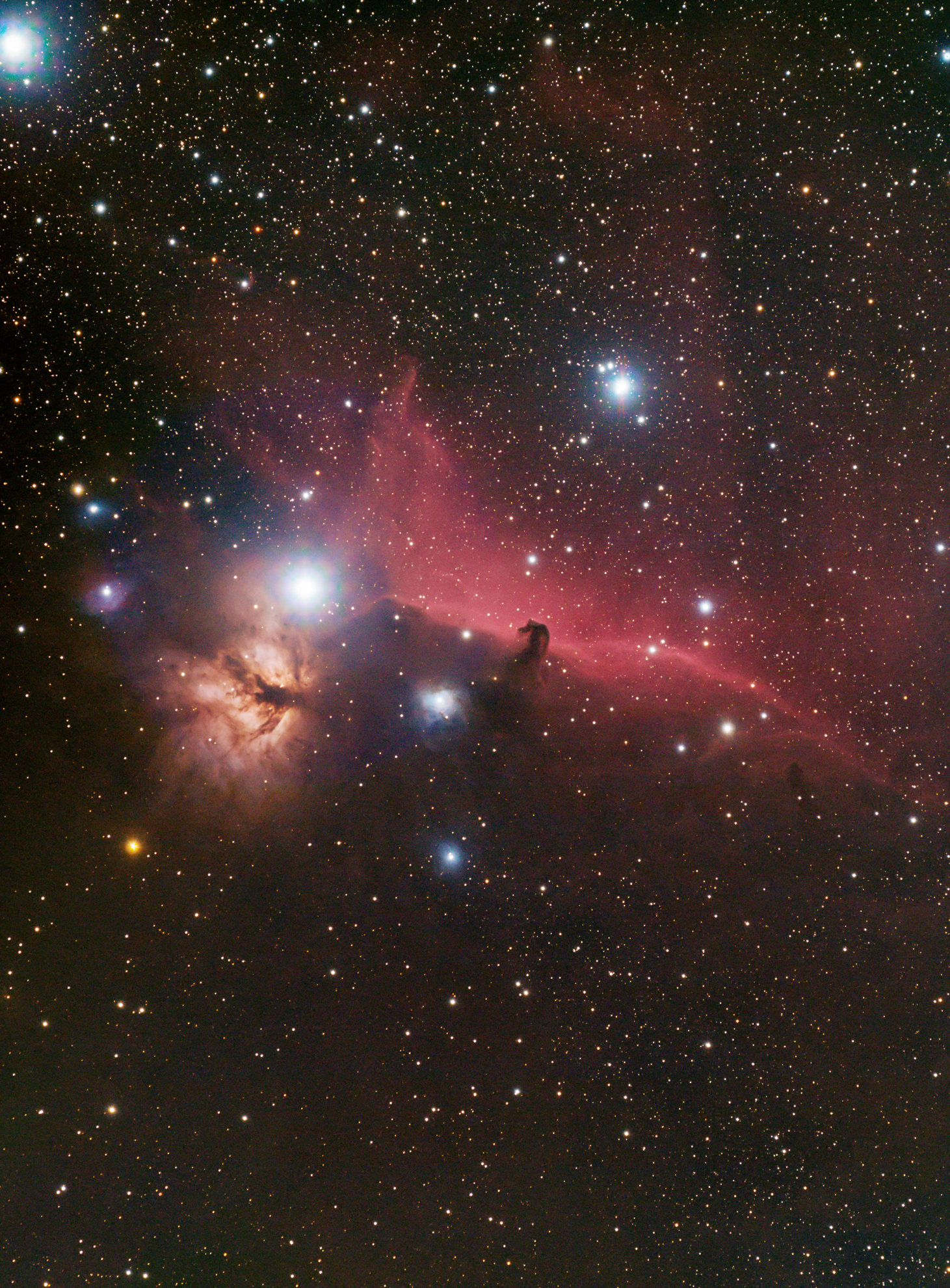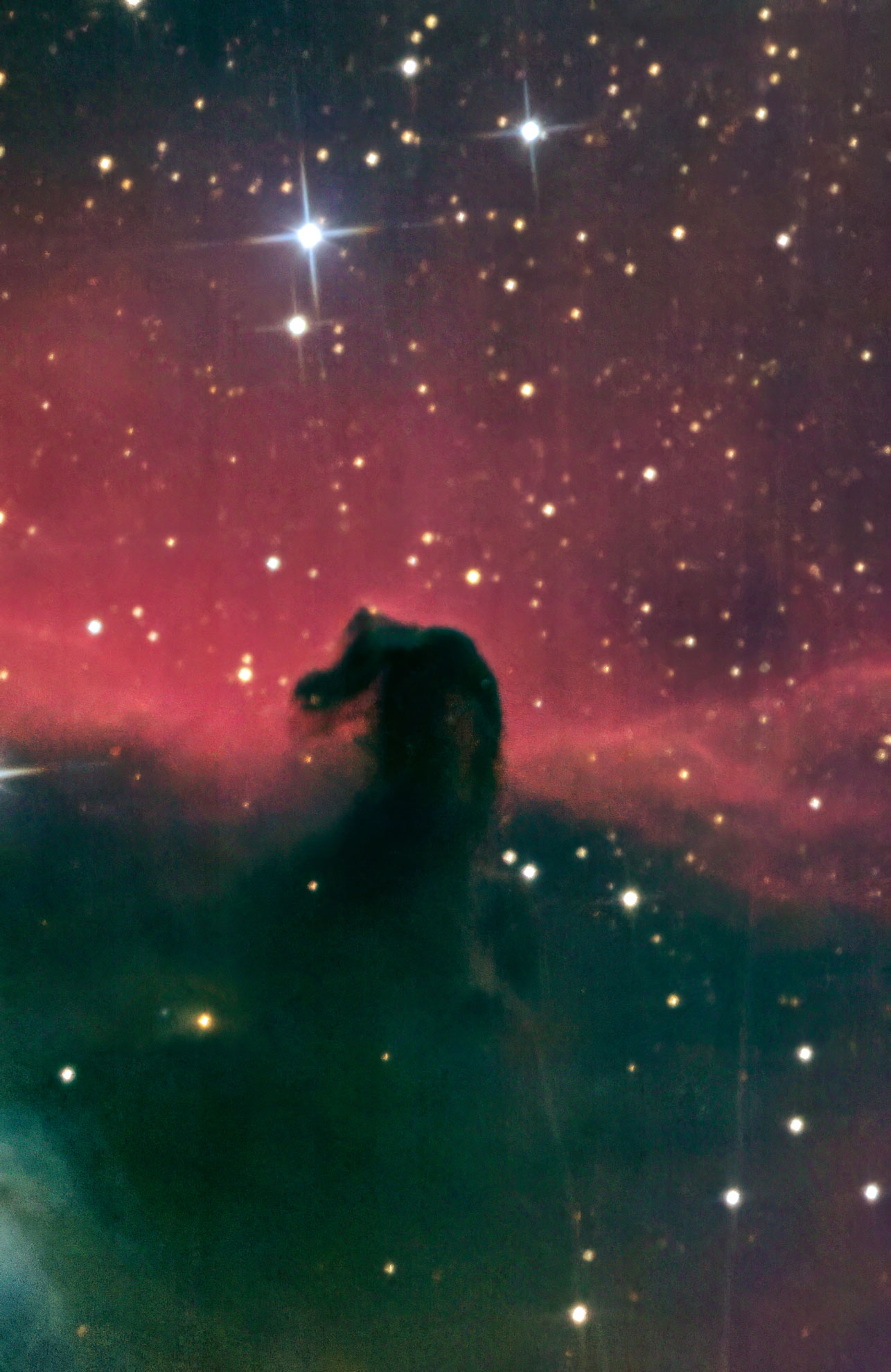 Der Pferdekopfnebel im Sternbild Orion ist ein Teil einer Dunkelwolke die etwa 3 Lichtjahre groß ist. Die Entfernung zur Erde beträgt etwa 1500 Lichtjahre.