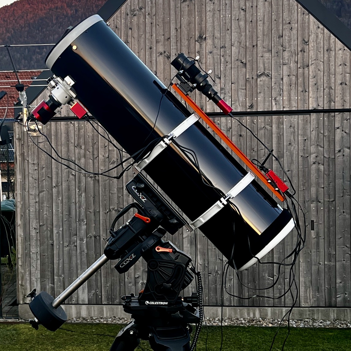 Die Idee war den Pferdekopfnebel möglichst groß mit einem Teleskop zu fotografieren ohne eine zusätzliche optische Vergrößerungen zur verwenden. Dafür habe ich das „alte“ Newton Teleskop aus 2014 „ausgegraben“ und eine alten ZWO 174MCC drauf montiert. Die 1200mm Brennweite des Teleskops und der Crop-Faktor des kleinen Bildsensors der Kamera machen die Vergrößerung aus.
