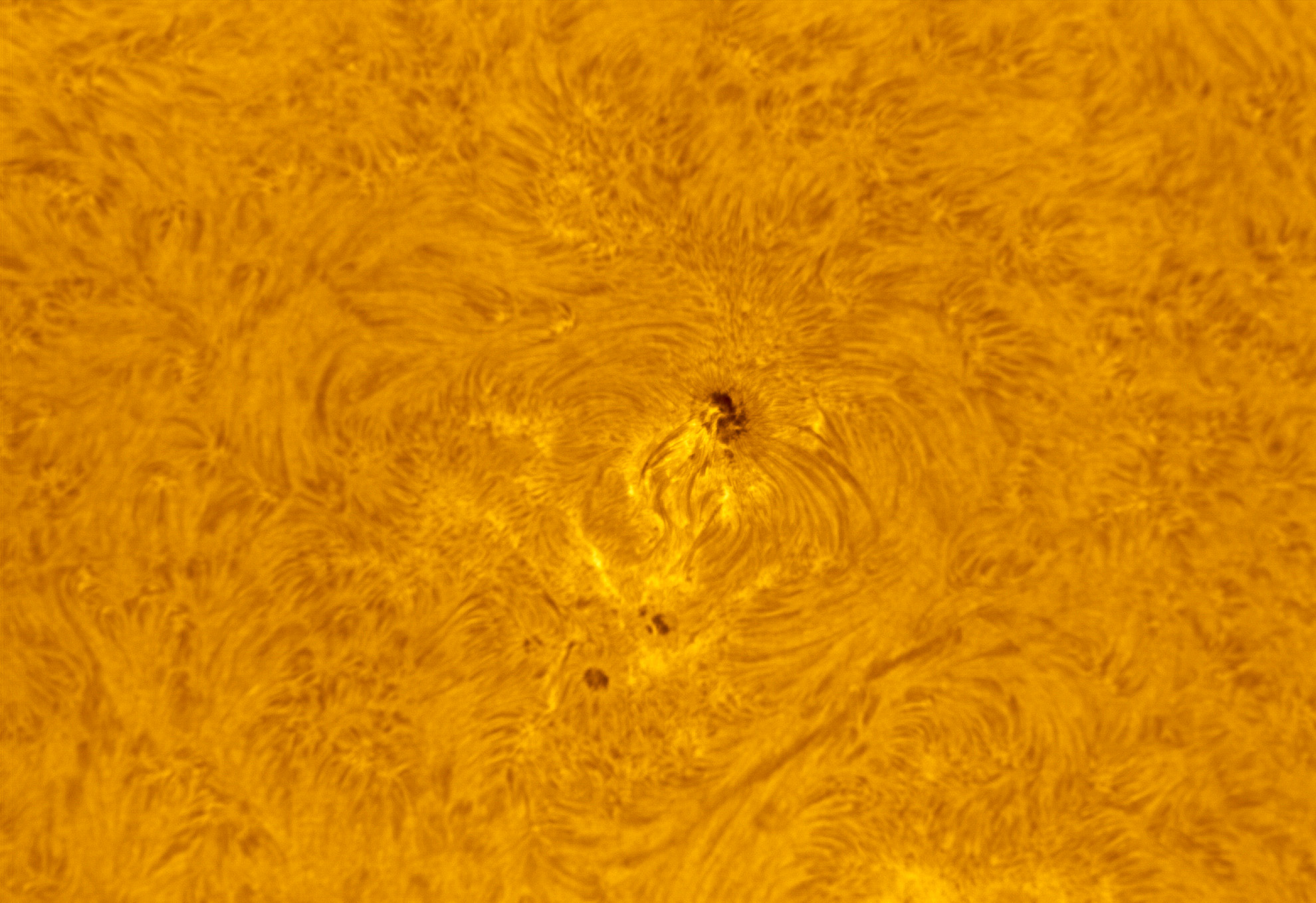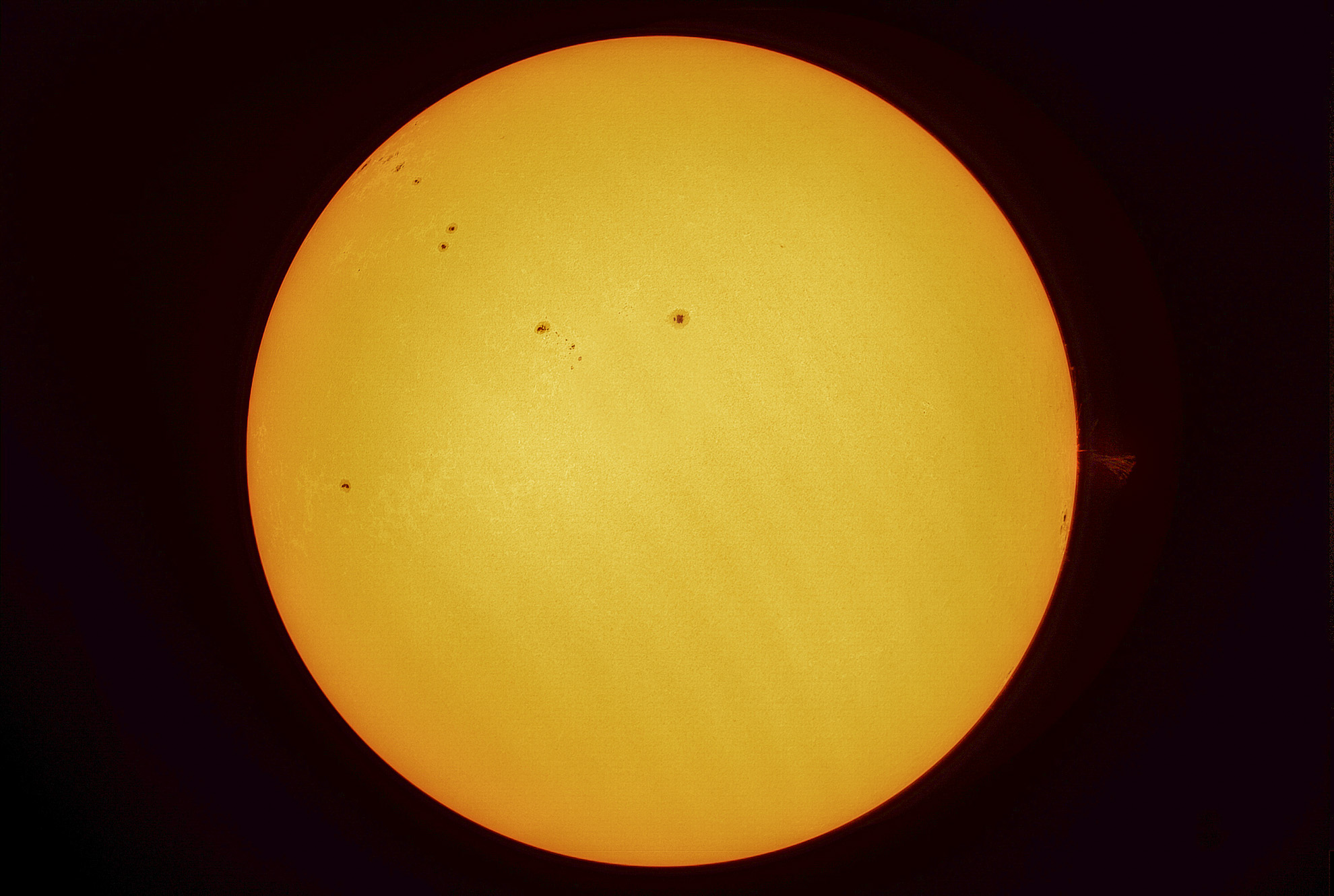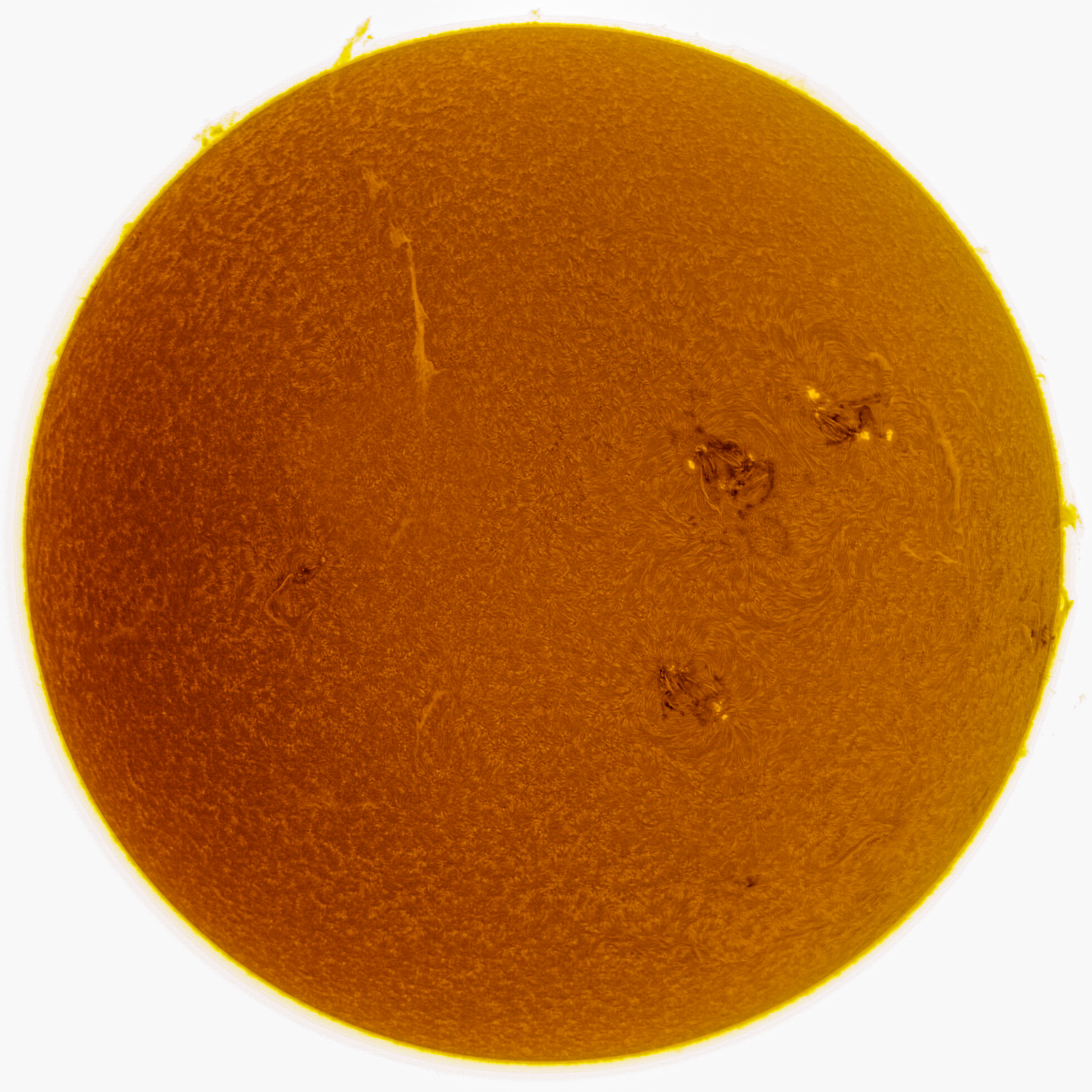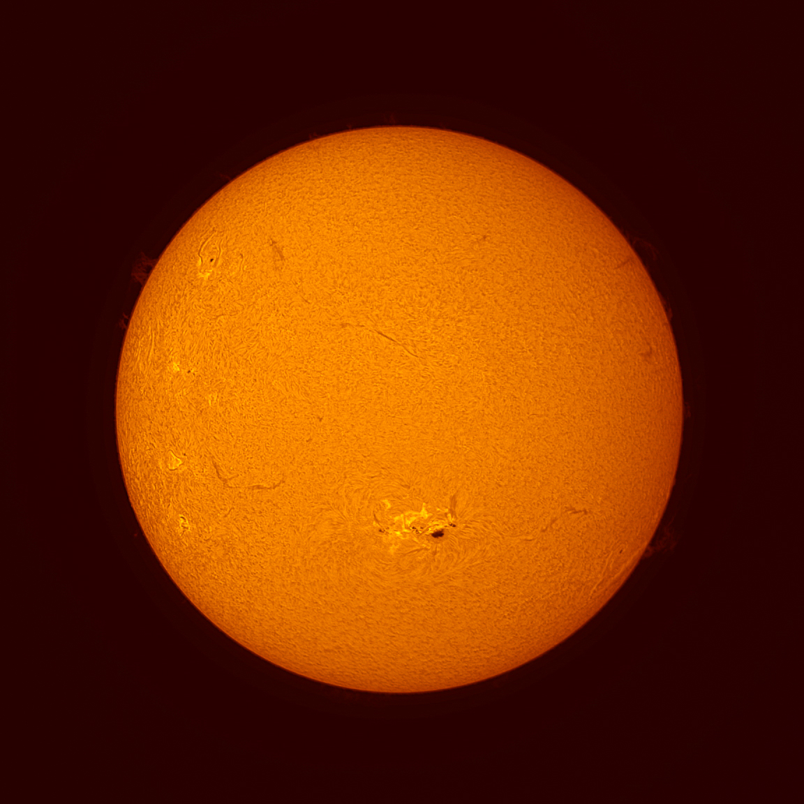 Die Sonne am Vormittag des 24. Juni 2024. Die Sonnenflecken aufgenommen mit einem Baader Tribant SCT und einer ZWO ASI432MM Kamera.