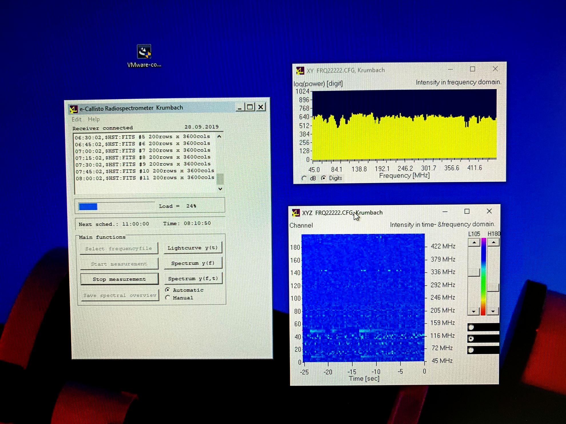 Unter ausführlicher Anleitung von Fritz Lensch dem Spezialisten für Radioastronomie, der Sternwarte ANTARES aus Niederösterreich, wurde 2018/2019 die e-CALLISTO Station in Krumbach aufgebaut und eingerichtet. Seit Herbst 2019 werden laufend die empfangen Daten der Sonne an die ETH Zürich gesendet.